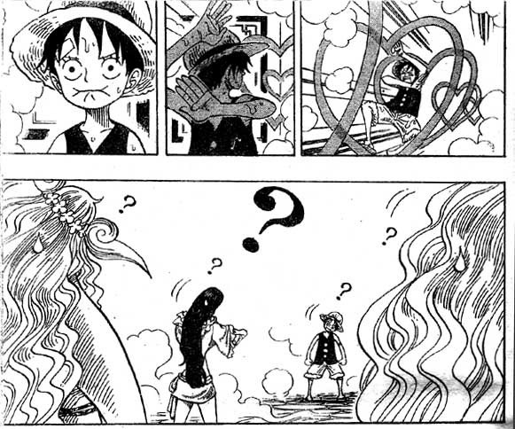 マリーゴールド、サンダーソニアは ヘビヘビの実モデルの能力者っぽいですね。住人には ゴルゴンの呪いだと説明しているのは、どういうわけなんでしょうか??背中に刻まれたものと関係がありそうですね。住人は悪魔の実の存在を知らなさそうですね。ルフィの能力を見て 男は伸びるのかと思っていたし。外海の情報を与えないのにも理由があるのでしょうか?