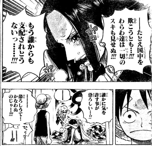 石にされたマーガレット達を元に戻すように頼んだルフィに、ハンコックが二択を迫ります。