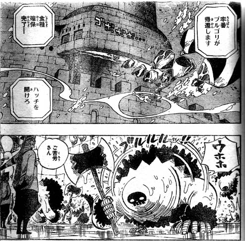 投獄された囚人は、百度の「地獄のぬるま湯」に突き落とされ 殺菌消毒を兼ねた“洗礼”を受けてからの入獄になるそうです。火拳のエース、七武海ジンベエ、元七武海クロコダイルは その洗礼を受けても 眉一つ動かさず 見事な入獄だったとの事。やはりジンベエも捕まったのですね!