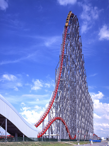 スチールドラゴン2000→営業開始当時、最高部高度97m、最大落差93.5m、最高速度153km/h、全長2479mの4項目でギネスブックに登録された、世界最大級のジェットコースター。現在でも世界最長。純粋な巻上げ式としては世界一を誇る。
