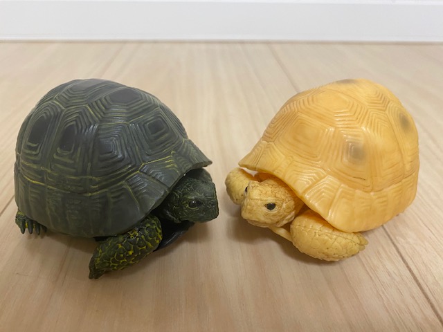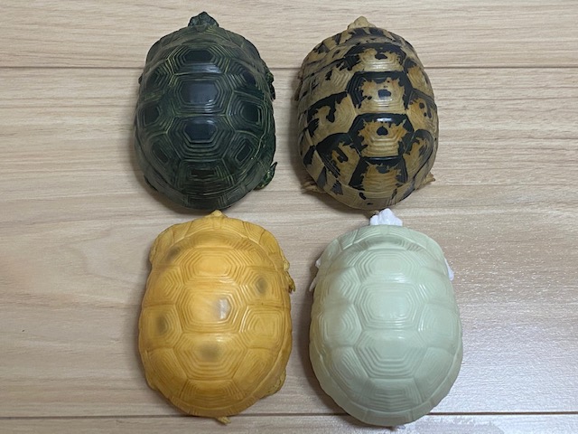 前回のガチャも含めて、ギリシャリクガメのノーマル、イエロー、ブラック、アルビノすべてコンプリート。やったね!こうしてみると、甲羅の色の違いが面白くて美しいですね。
