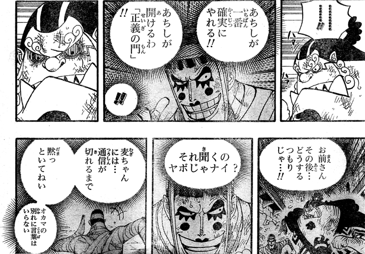 インペルダウンを出る前に 正義の門は自分が開けるとボンちゃんが自ら申し出て、通信が切れるまで黙っといてとジンベエに伝えていたのです!なんて・・・なんて格好いい人なんですか!!