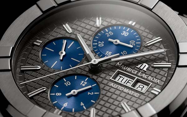 チタン製の外装に合わせられたガンメタルカラーをベースにしたダイアルは、これまでのアイコン クロノグラフにもあるように格子状のエンボス加工が施されている。無機質なカラーリングの中で映えるブルーカラーのインダイアルは、高いコントラストを生み、サークル状のパターンがデザインされている。