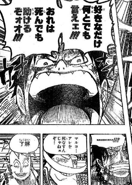 エースの処刑時刻が早まると白ひげに伝え、対等に喋るルフィ!それに驚くイワ様達!