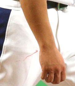 山井投手の右太ももに一筋の血痕が付いたのは五回。