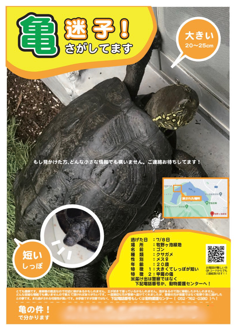 お巡りさんが、野生の亀と勘違いして、届けられたゴンちゃんを放流してしまったそう。