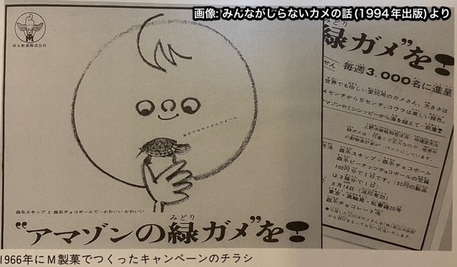 1960年代半ば、「この可愛い亀たちを子供たちに知ってもらいたい」という思いから、M製菓が「アマゾンの緑ガメが当たる」という企画を行います。景品になったミドリガメは、南北アメリカ大陸産のアカミミガメ・キバラガメ・クジャクガメなどランダムだったそう。