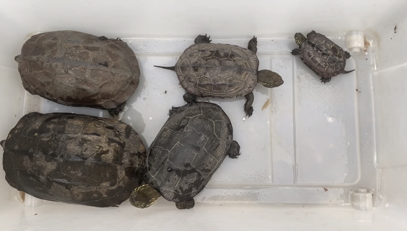 今回捕獲されたニホンイシガメの甲羅には、齧られた跡が多数。外来・在来種ともに色々な生き物がいますが、何に齧られたのかは分かりません。