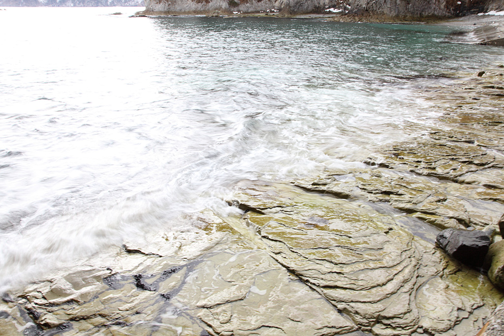 波打ち際の白波は完全に白糸状態になっていますが、全体の