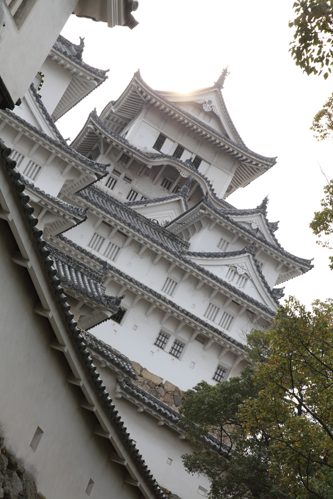 にも重なる屋根、千鳥破風(はふ)や唐(から)破風が、白漆喰総塗籠造
