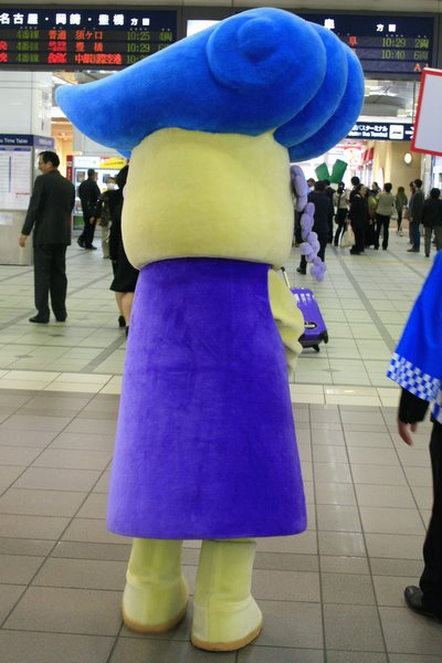| 平成16年の市政50周年を機に市内在住の漫画家、くらはしかん氏のデザインで誕生。 着ぐるみは比較的最近登場したようです。 髪の毛は木曽川の流れをイメージ、服と髪飾りは藤の花をイメージしています。 |