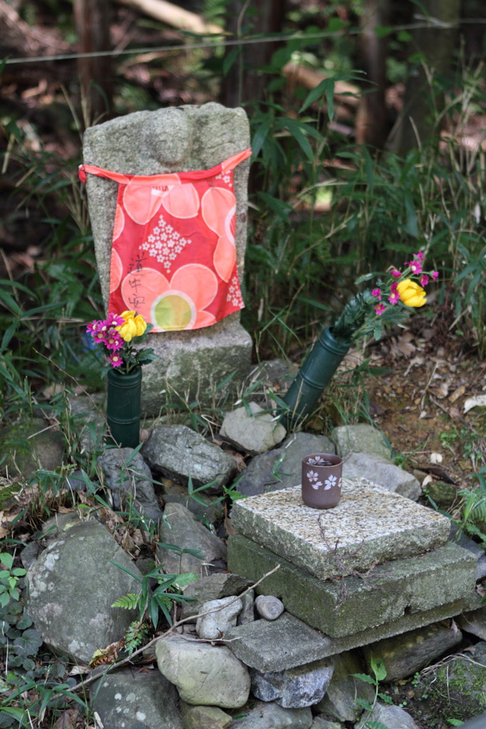 道中安全・花が添えてあります。石が積んであります。心に訴えるものがあります。
