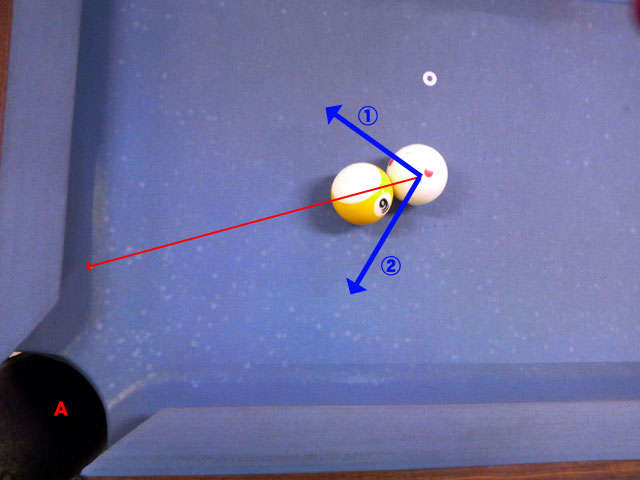 写真の配置で9番ボールをAのポケットに入れたいと思います。どのようにショットするのが最も確率が高いでしょうか? ただし、手玉と9番ボールは完全に密着している状態とし、手玉の中央、接点、9番の中央を結んだ方向を示す線を赤い線で示すものとします。 (写真をクリックすると拡大されます)