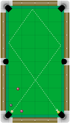 ファイブ&ハーフシステムと呼ばれるクッションを利用した基本的なショットです。手玉の上下左右を撞く事でクッションからの手玉の動きが変わります。