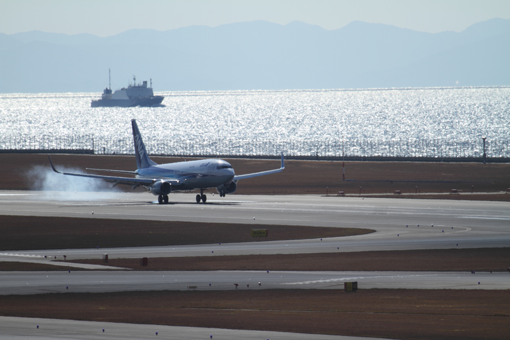 タッチダウンの瞬間です。ここからエアーブレーキと総ての制動力を駆使して、機体を所定の場所までに減速させます。