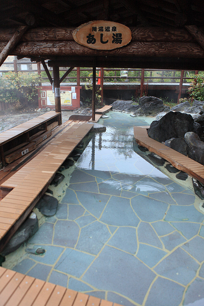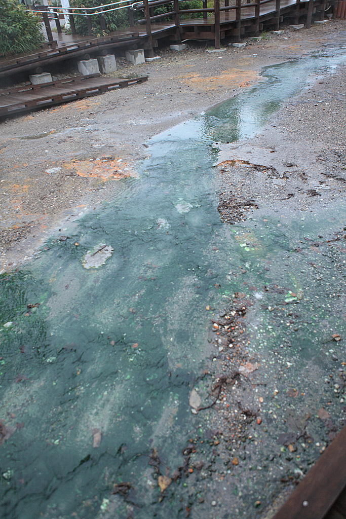 川底が濃い硫黄成分によってヒスイ色に変色しています。縦撮り+斜にいれることにより、スピード感をだしています。