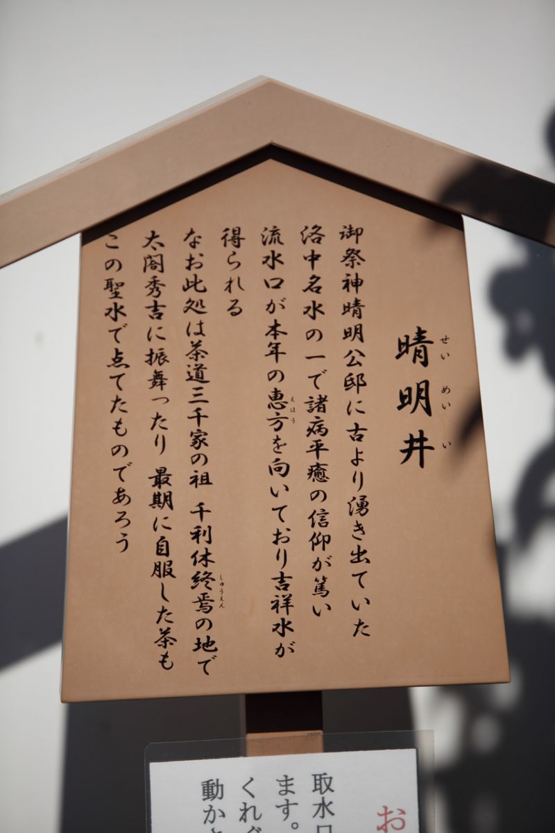 晴明井本殿の北には、晴明井といわれる井戸があり、ここから湧く水は晴明水と呼ばれ、晴明の陰陽道の霊力より、湧き出たといわれ、無病息災のご利益があるといわれている。伝承によれば千利休が茶会において、この井戸から汲んだ水を沸かし、茶の湯として利用していたといわれ、豊臣秀吉もその茶を服されたと伝えられている。この井戸は五芒星(晴明紋}を描き、その取水口がその星型の頂点の一つにあり、立春には、晴明神社の神職がその晴明井の上部を回転させ、その年の恵方に取水口を向けるのが、慣わしとなっている。