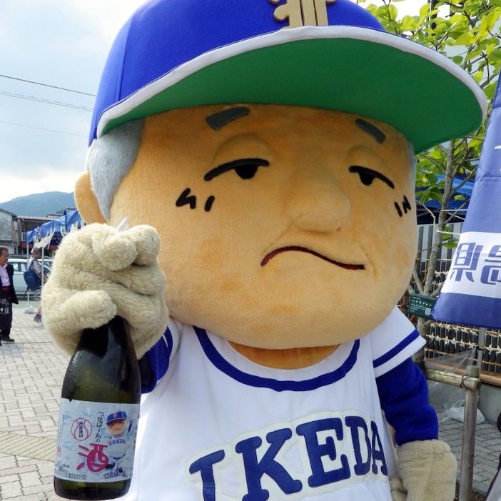 | 「攻めだるま」の異名をもった池田高校野球部元監督の蔦文也氏がご当地キャラクターとして蘇った。 酒好きだったことからモチーフのお酒も発売されている。 |