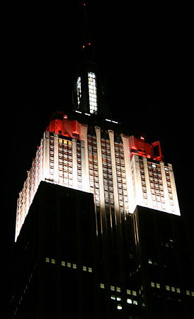 【画像左:WBC日本優勝を受け「日の丸」色に輝くニューヨークのエンパイアステートビル】