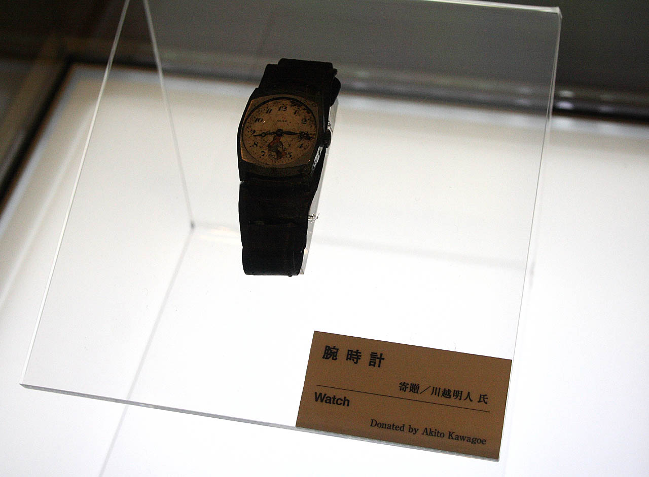 時計の写真⇒被爆した時間で時計の針は止まっています。このときに何が起こったのか?時計は無言で語りかけてくれています。