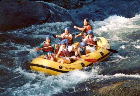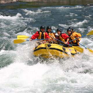 ラフティングとは、6〜10名で大型のゴムボートに乗り、川の激流を下っていくスポーツ