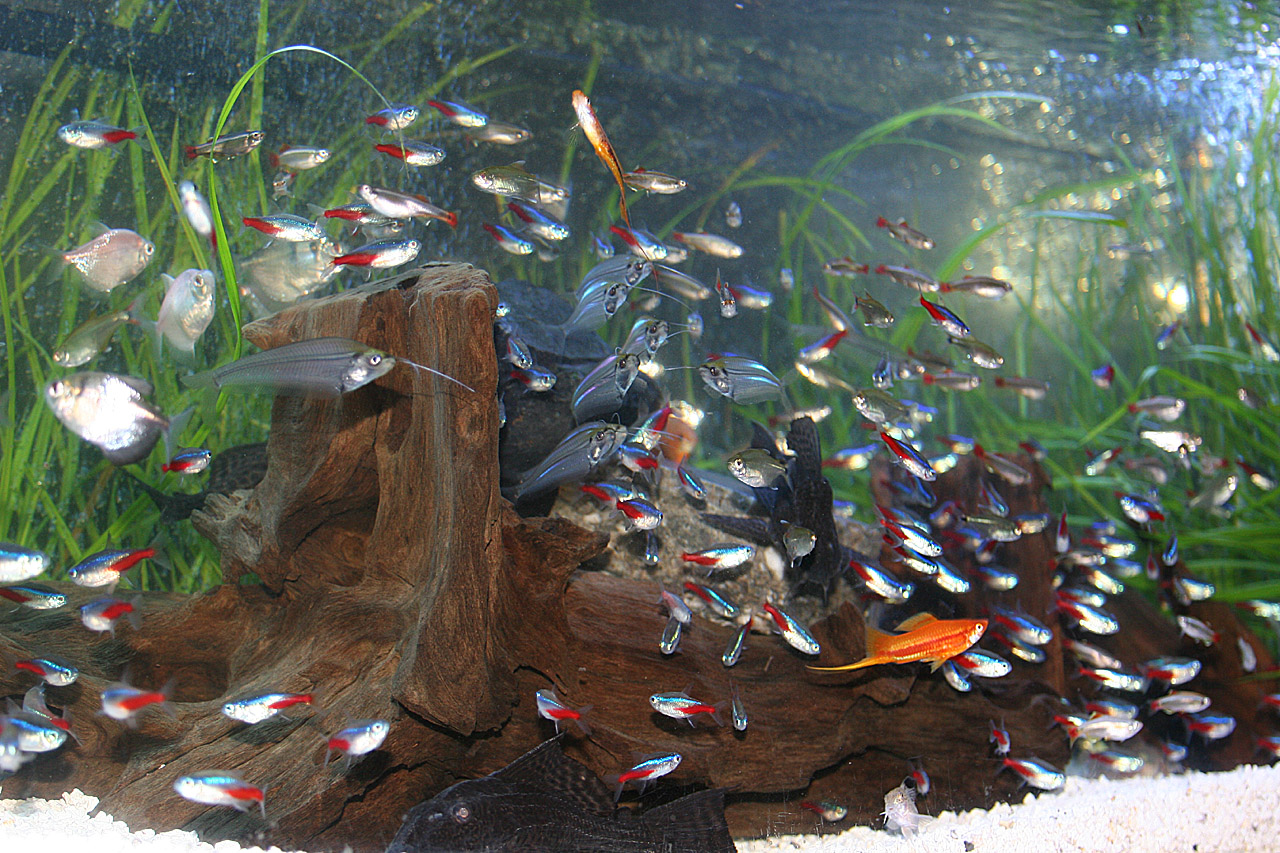 ネオンテトラという小魚です。熱帯魚の中では入門魚種