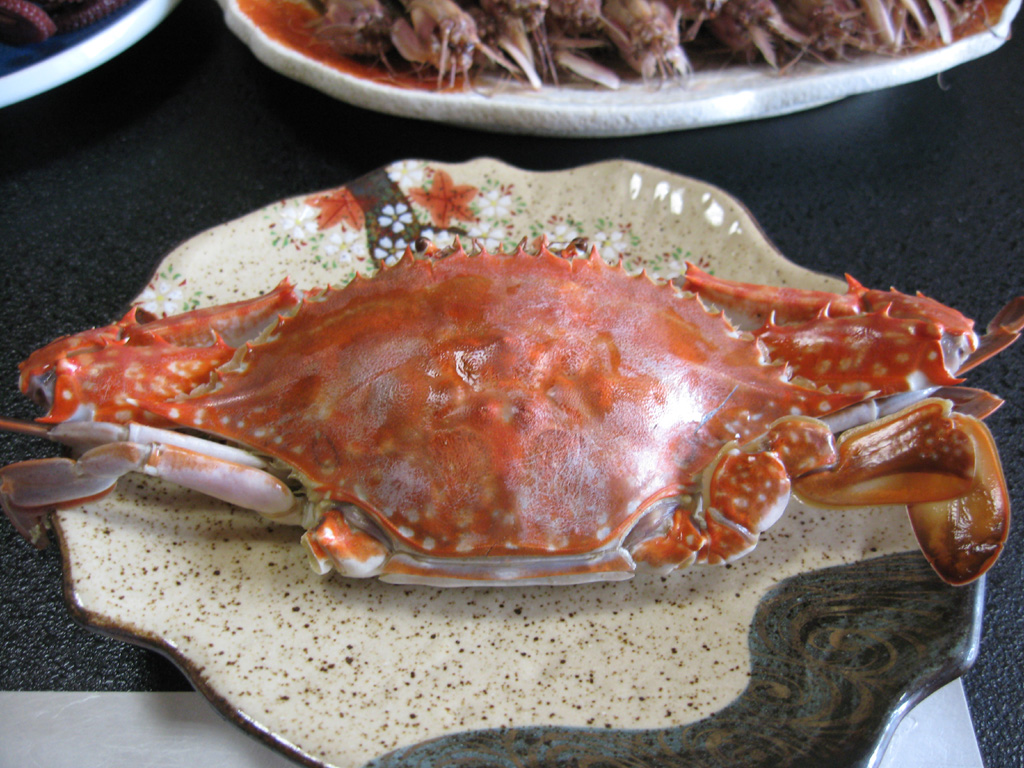 蟹のゆでたのは、ガザミ(わたりがに)といって、昔は安くて庶民の味方だったのですが、昨今漁獲量が減って、しらない間に出世して希少価値が出てきた蟹です。