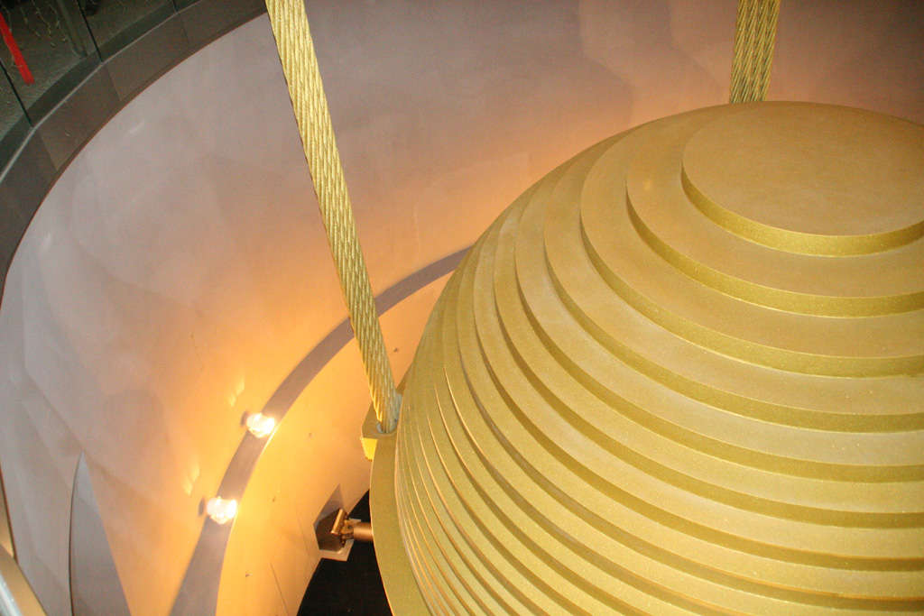 このビルの新技術はエレベーターだけではありません。金の玉?(写真右)がハイテクなのです。台湾は地震も多いが、台風がすごいのです。日本に来る台風なんぞものの数に入らず、風速60mUPが来ても普通?といった感じです。その暴風に対応するために金の玉があるのです。詳しくは以下に・・。