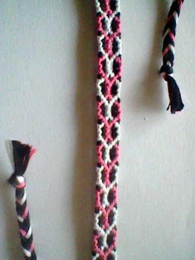 第五問 このミサンガの糸構成を答えよ(配点10点) ただし、このミサンガは次の構成であるとする。 主色:ピンク、ホワイト 背景色:ブラック (主色は必要最低本数) -公式群- (糸の本数)=(斜め一列の結び目の数)+1本 -ヒント- カッコ内を選択してください。本数が白で書いてあります。 (糸の本数は10本)