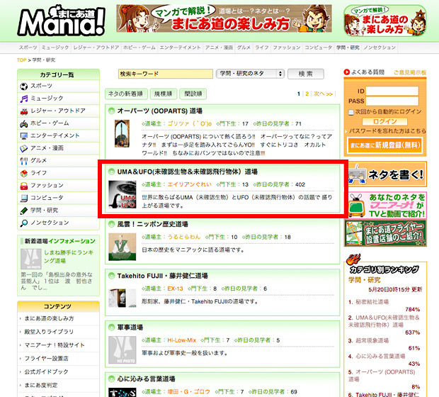 このUMA&UFO道場はトップページの右にある「カテゴリ一覧」の